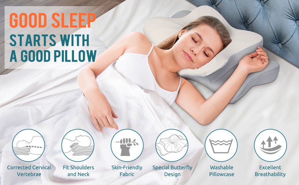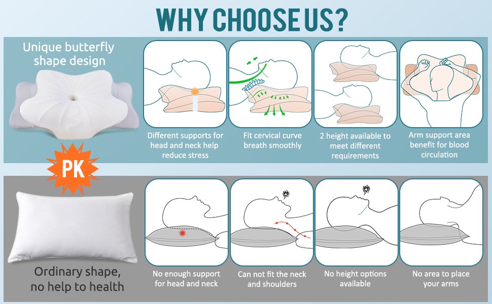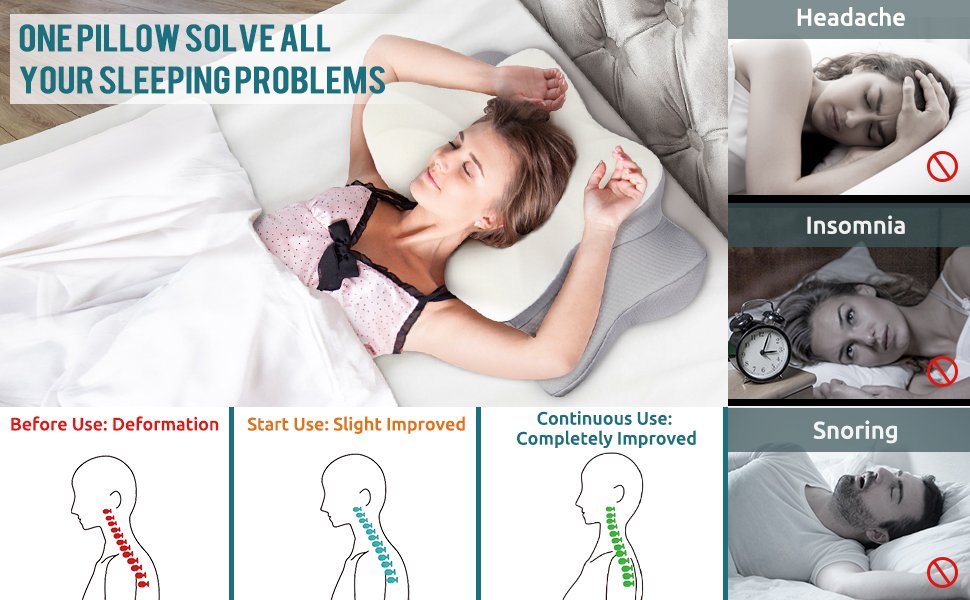 【QUALITY SLEEP STARTS WITH A GOOD PILLOW】Are you always waking up with neck cramps or back pain? Our proven ergonomically designed, contoured memory foam pillow supports your head, neck, shoulders and back perfectly. The innovative design allows our pillows to naturally fit your curved spine perfectly, providing proper support for spinal alignment,makes you to shift between positions comfortably.So you will wake up relaxed and start a more energetic day.